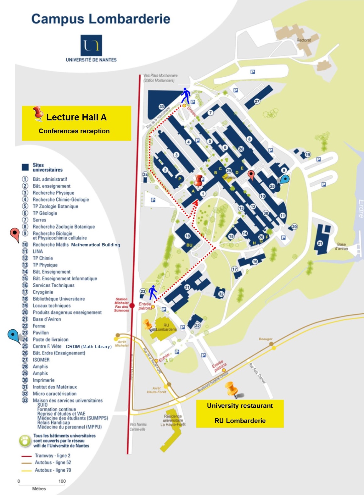 Upon your arrival at the main station ("La Gare"), take the north exit ("Sortie nord") and follow the direction to the tramway stop, (Line #1, La Gare) in front of the main entrance of the station. Take the tramway in the direction of "François Mitterrand". Get off the car at "Place du Commerce" and take the tramway line # 2 in the direction of "Orvault-Grand Val". Get off at "Michelet Sciences", enter the campus and walk to the math buliding following the red path in the map above. You may use the campus map provided above.